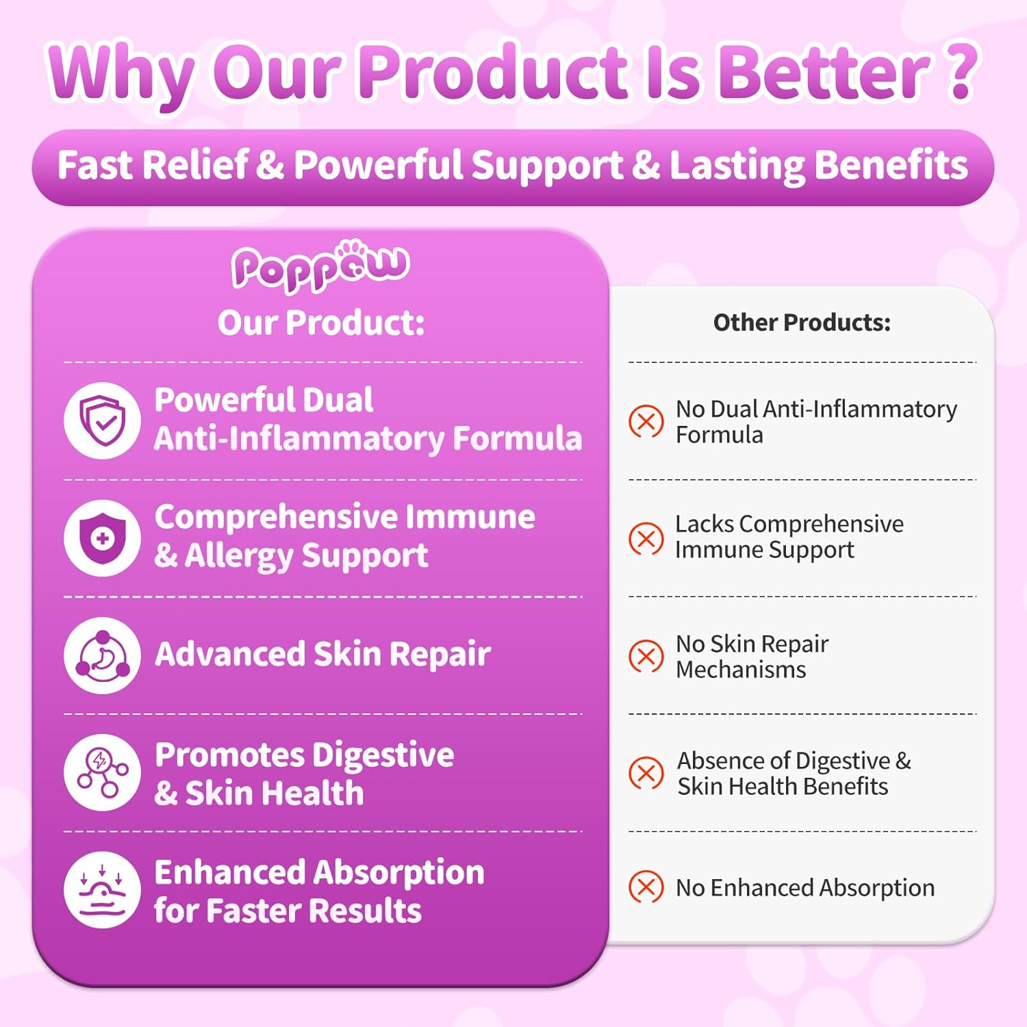 - Skin Comfort & Soothing Care – Our dog allergy chews are formulated with turmeric and quercetin to help maintain skin comfort, ease occasional itching, and support dogs’ sensitive skin when challenged by scratching